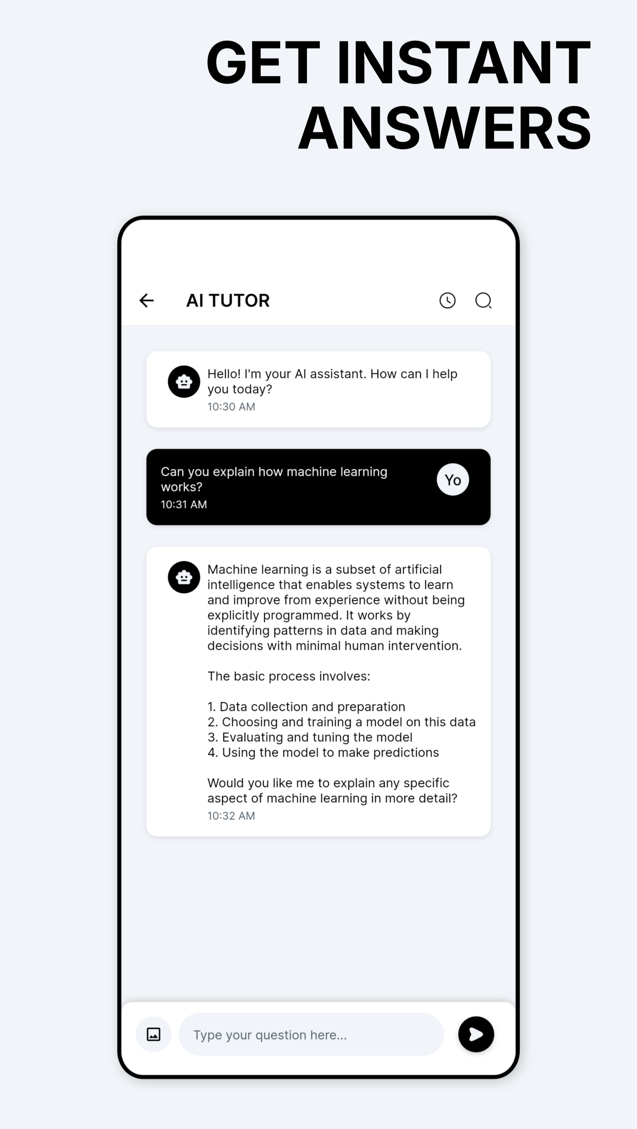 Learning becomes effortless when you can talk to your AI TUTOR anytime. Our chat feature lets you ask questions, explore ideas, and get clear explanations instantly — making studying interactive, fun, and productive.